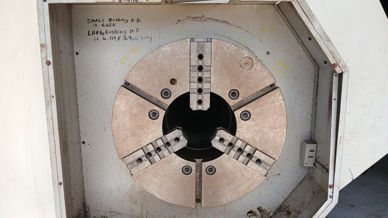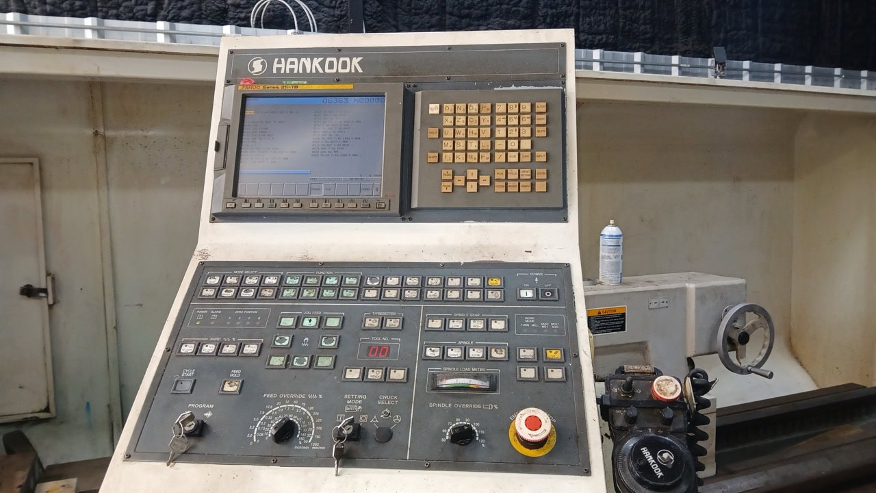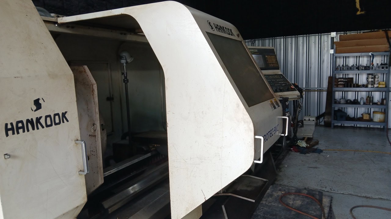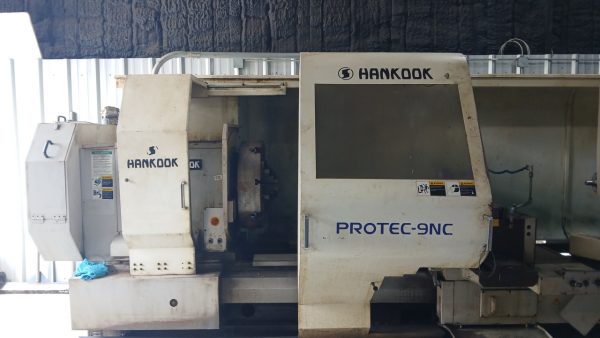 37.4″ x 156″ Hankook Protec 9NC 10″ Spindle Bore, Dual Chucks, 2006 – Chip Conveyor, 8 Station Turret