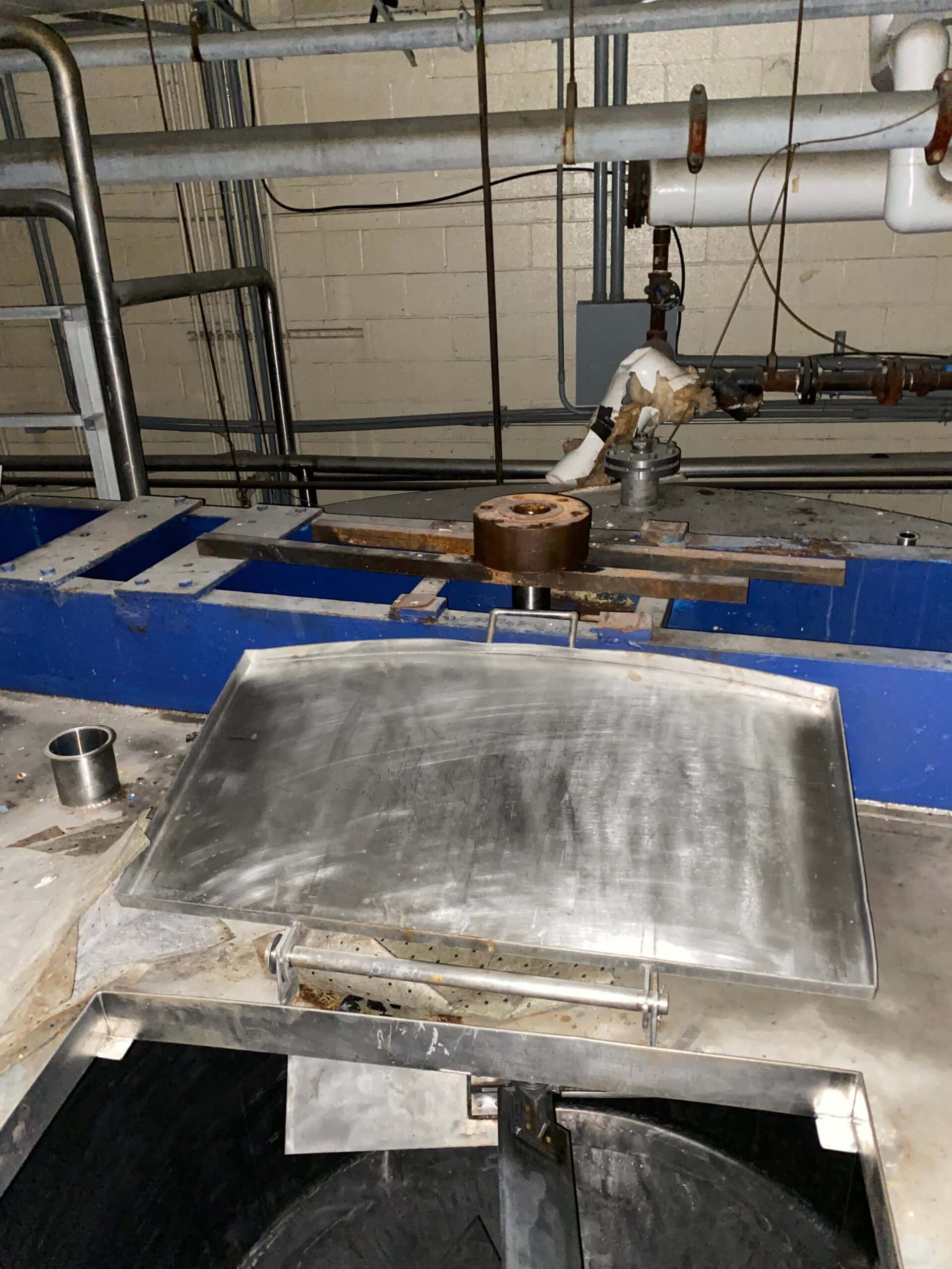 6500 gallon Stainless Steel Tank, Insulated and Dimple Jacket sides and bottom 1″ threaded connections. Pressure not known – TBD. Measures 10′-4″ diameter x 10′- 3″ Straight side height Dished top and bottom heads. Top openings are: 24″ x 16″ Manway with cover, 6″ Tri-Clamp, 4″ Flange. Bottom openings are 2″ Tri-Clamp for drain, and 1″ Threaded Jacket Connection. Tank includes full length agitator shaft with turbine blades. Also has Carbon steel bridge for agitator gearbox and motor.