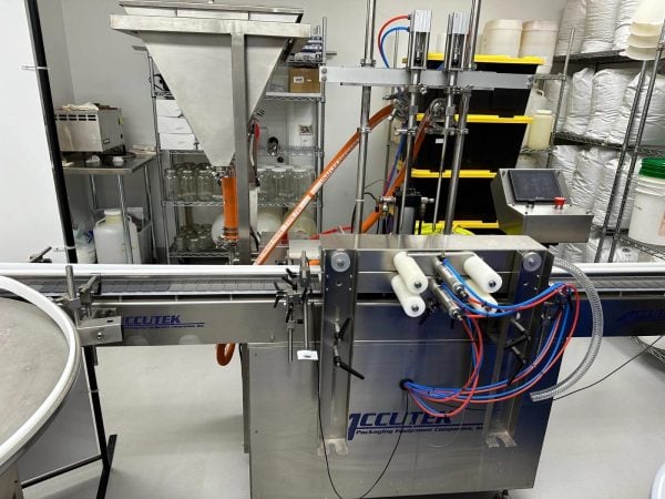 Accutek Hot Fill Bottle Filling Line with AVF2-16 2-Head Volumetric Bottle Filler with Heated Hopper, 2018 – Previously ran 1 Oz, 2 Oz, 4 Oz, 8 Oz, and 16 Oz Boston round Bottles and 1 Oz and 4 Oz Topical Jars