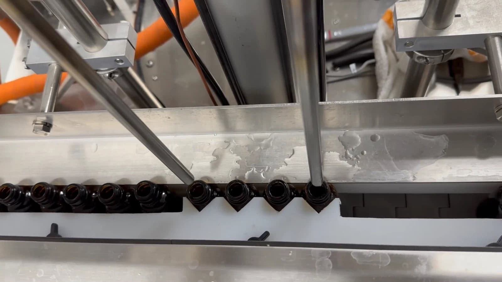 This system is set up to fill, have caps hand-applied by operators, and then a semi-automatic spindle capper torques the caps down before the bottles collect on an accumulation table.
