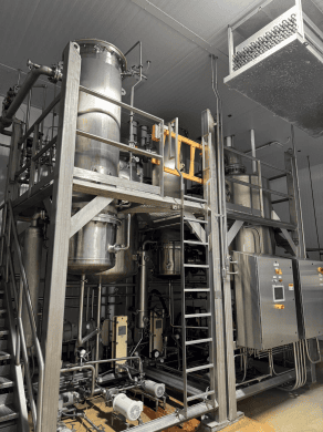 —DOUBLE-EFFECT, REVERSE-FED RISING/FALLING FILM EVAPORATOR SYSTEM Designed for concentrating hydrolyzed slurry or similar foods / protein-based liquids.